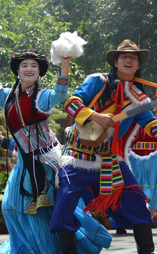彝族在云南境內(nèi)約471萬(wàn)人,是省內(nèi)人口最多、分布最廣的少數(shù)民族,主要聚居在金沙江、元江流域和哀牢山、無(wú)量山腹地。彝族是一個(gè)能歌善舞的民族,民間打歌、跳樂(lè)之風(fēng)盛行,大三弦、跌腳舞久負(fù)盛名?;鸢压?jié)是彝族最具特色的民族節(jié)日。彝族村占地50余畝,三虎浮雕墻與虎頭內(nèi)祖師形象表現(xiàn)了彝族虎鷹文化。太陽(yáng)歷廣場(chǎng)圖騰柱上有太陽(yáng)、虎、火和八卦圖形象,周?chē)h(huán)繞著10個(gè)朝向不同的月球造型,外圓周有12生肖石雕。依山而建的“...